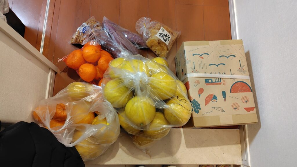 道の駅で柑橘類といもけんぴを購入。帰り道で文旦を売っている所があり寄り道しました。おばちゃんに少し説明してもらい土佐分担を1袋18個入りで4500円、八朔とサツマイモ、ポンカンを購入。支払いが現金だけだったのでお金を確認していると300円安くしてくれました。