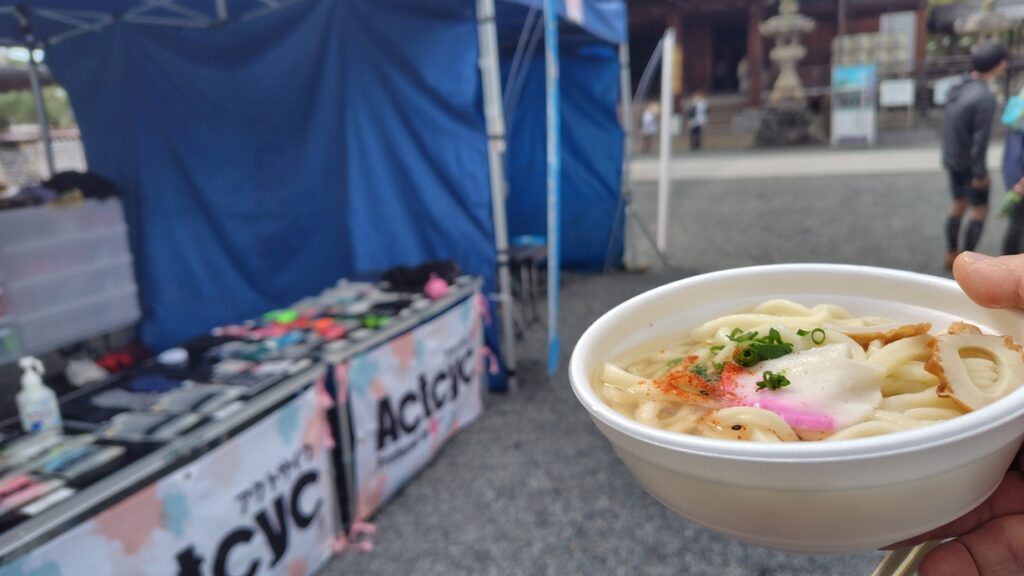 この善通寺五岳山空海トレイルはゴール後に宿坊で温泉に入れます。その後、うどんを食べてまったりできるのがうれしいポイントだと思います。(トリプルは別)今年は食べ物の出店が少し少なかったので残念ですが、街中でアクセスも良く、電車でも来れる大会なのでトレラン初心者にもお勧めだと思います!(ちょっと危ないですが・・・)
