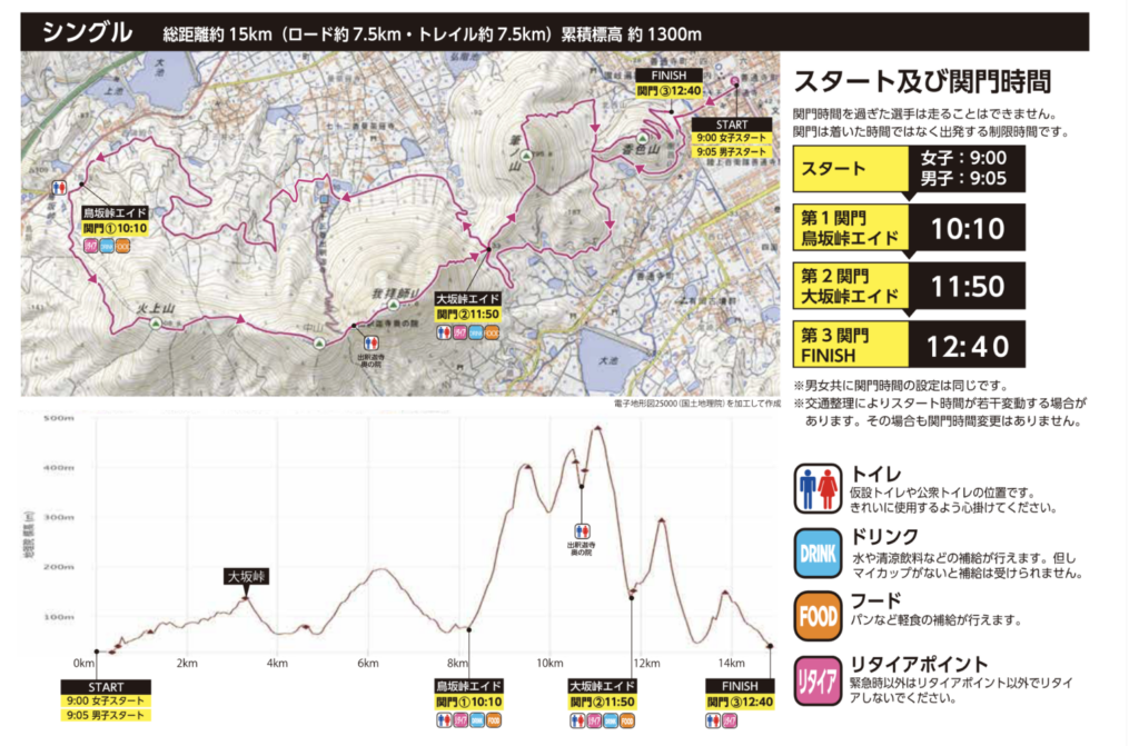 15kmの約半分がロード区間となります。ロードでもアップダウンが相当あるので走り切るのはある程度の体力が必要になります。