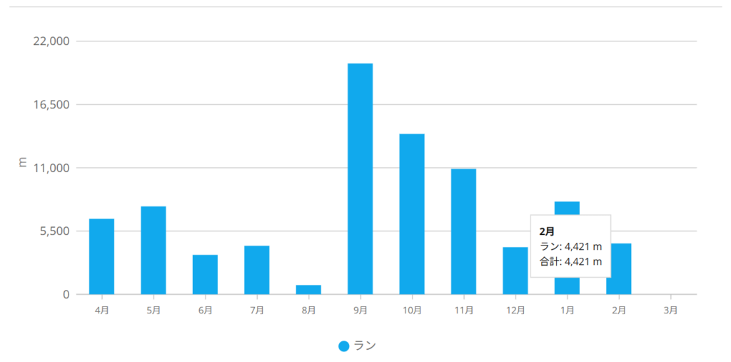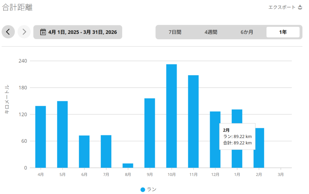 全体的に脚の耐久力が不足していると思います。2月に体調を崩したことでやはり走る量が減っていたのも影響したかもしれません。善通寺省くと、2月は75km位でした。