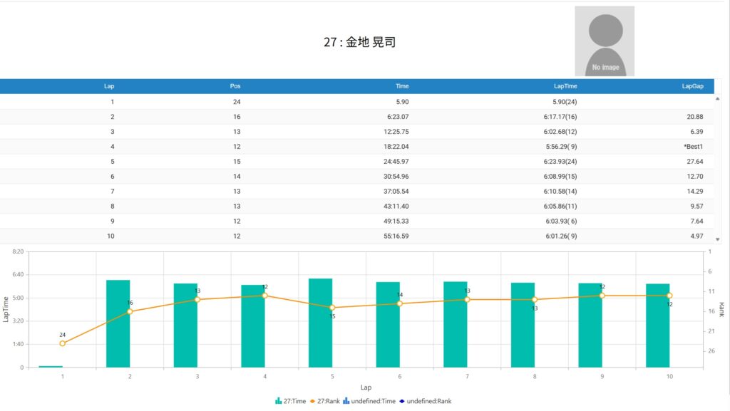 4周目にタイムがガタ落ち。腰が爆発寸前でだましだまし乗っていましたが、22:30頃にしびれを切らした後続が追い抜き様に接触で吹っ飛ばされてパックから脱落。腰の状態は終盤へ向けて徐々に回復。